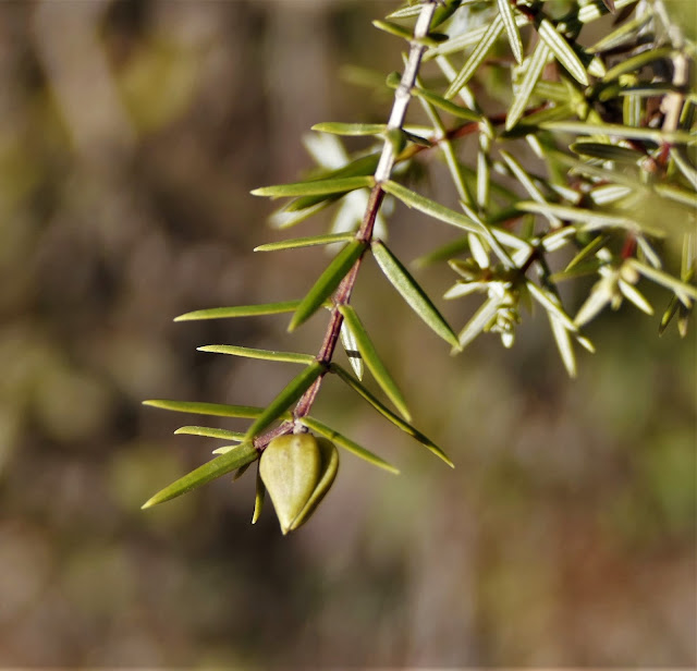 Estròbils masculins de Juniperus oxycedrus. Aspecte molt botit i turgent dels sacs pol·línics. Hi ha proteràndria. Trobar ara estròbils femenins és encara difícil.