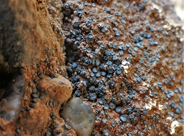 Aquesta roca està coberta d'un liquen crustaci blanc, profusament pigat pels ocels -ostíols- dels peritecis, òrgan comparable als apotecis, sinó que, a diferència d'aquests, aquells estan immersos a l'interior del tal·lus i amollen les espores per aquestes obertures. Possiblement del gènere Verrucaria.
