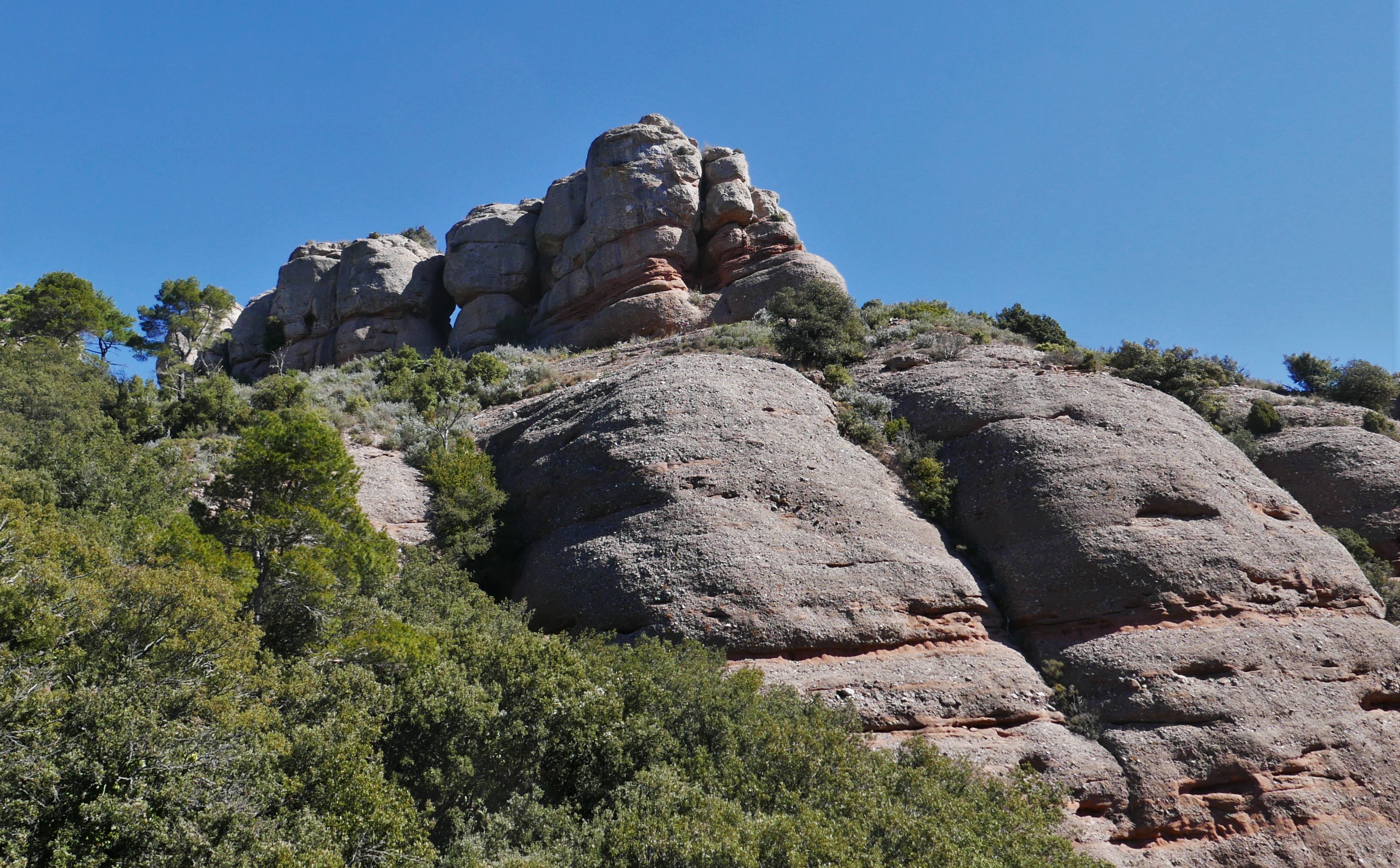 ROCA SERENY: MATERIALS SORRENCS. Els relleus de la Roca Sereny corresponen a un banc gresenc residual, entreviat de conglomerats. Aquests gresos donen formes tabulars poc resistents a l’erosió. A la base d’aquest estrat, que es troba en ple procés de reculada, laminació i destrucció, hi ha una capa argilosa propícia per a la vegetació, i per dessota d’aquesta –no visible a la imatge-, el conglomerat panxut, massiu, poligènic i heteromètric, típic del massís.