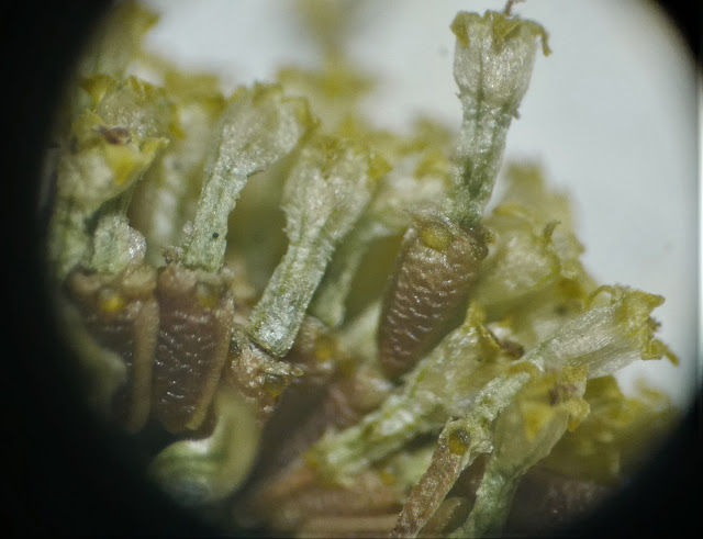 Visió de les cares abaxials dels aquenis, amb les glàndules -cavitats, bosses, etc.- resiníferes brillants, ben definides. Aquestes bosses de greixos les relacionaríem, de bell antuvi, amb la dispersió a càrrec de les formigues -mirmecocòria-, però la retracció que experimenten, en el fruit, sembla que no justificaria gaire aquest supòsit.